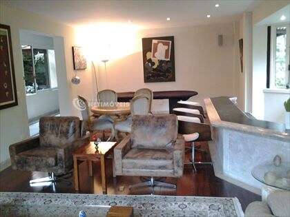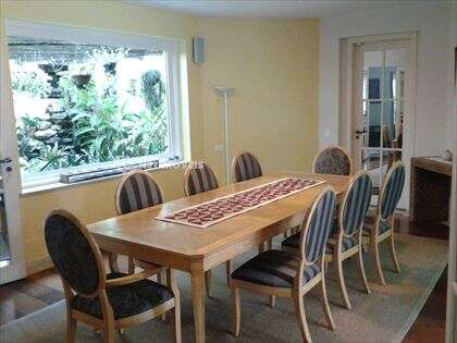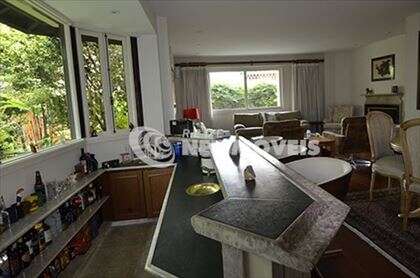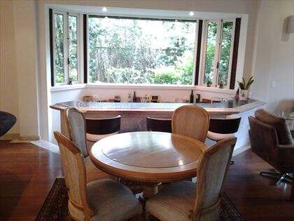 Tem ampla sala com bar, jardim de inverno, uma grande adega, sala de jantar separada, que dá para um terraço e amplo jardim com piscina que tem banheiro de apoio. Tem escritório, sala de jantar, sala de almoço, sala de TV, cozinha com dois ambientes, ampla dispensa, área de serviço espaçosa, com dois quartos e um banheiro. O jardim é cheio de árvores, tem piscina e churrasqueira, sauna e uma quadra de squash oficial no subsolo , além de uma adega que comporta mais de mil garrafas. Na garagem cabem 4 carros grandes um ao lado do outro em área coberta ,e no total, consegue receber muitos mais carros.